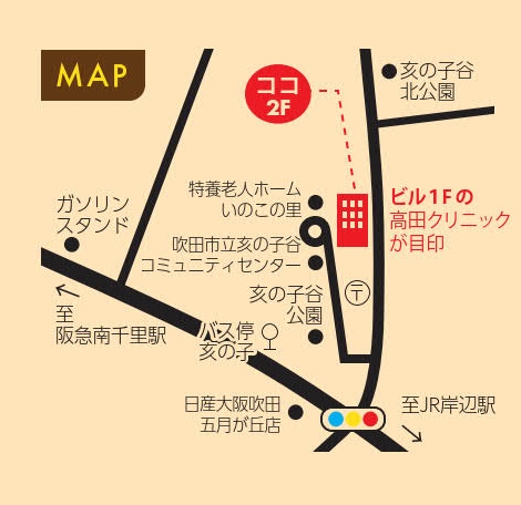 当店の場所の目印として、山田西郵便局を目指して下さい。郵便局の隣の隣の医療ビル2Fになります。